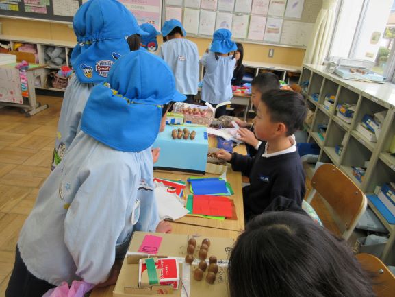 今日は1年生が「おもちゃランド」にそらぐみさんを招待しました。秋みつけで集めたどんぐりを活用した「おもちゃ」(どんぐりめいろ・どんぐり落とし・どんぐりマラカスなど・・)をつくってお店を開き、そらぐみさんに楽しんでもらうという内容です。1年生は「いらっしゃいませ!」と大きな声で呼びかけたり、遊び方の説明をやさしくしたりと、一生懸命もてなしていました。そらぐみさんは最後に「楽しかった!」と言ってくれて、1年生たちはほっとした表情でした。1月は幼稚園にお邪魔することになるのかな。また一緒に遊ぼう!とみんなでお見送りする1年生でした。
