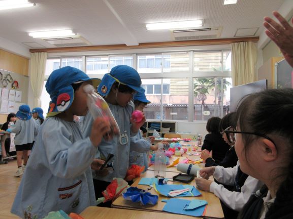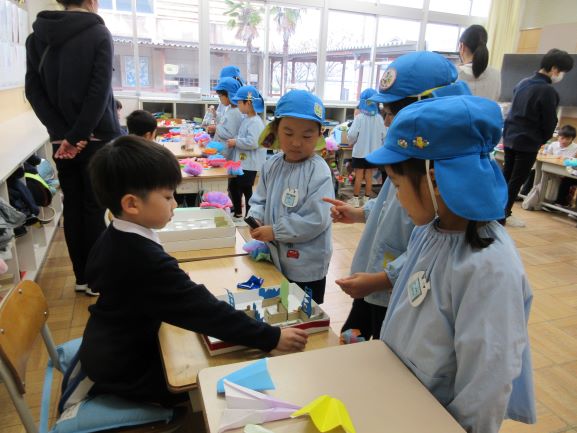 今月のさくら会は上田上幼稚園の作品展をみんなで観させていただきました。幼稚園のそらぐみさんが1年生を案内して、いろいろな力作について解説してくれました。思い思いの作品に1年生の子どもたちは「すごいなあ」と感心しながら観ていました。残りの時間はそらぐみさんの教室で「伝言ゲーム」を楽しみました。「いちごとみかん」という言葉がなぜか「いちご食べたい」になっているチームもあり、変化が起こってしまうのがおもしろい!と喜んでいました。そらぐみさん、幼稚園の先生方ありがとうございました。次は小学校で一緒に活動しましょう。