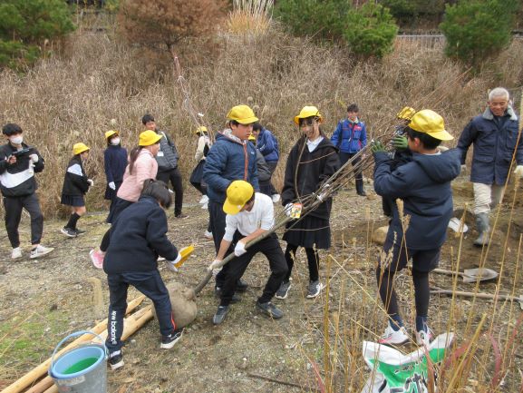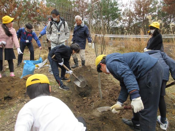 砂防学習のあと、卒業記念の植樹に行きました。昔田上山に大きな栗の木があったことにちなんで、2本の栗の木を植樹しました。この植樹は今年度で51回目にあたるそうです。2mくらいある大きめの栗の苗木を植えるために、みんなで交代で大きな穴を掘りました。その中に腐葉土や肥料を混ぜながら苗木を植え、倒れないよう柵や記念のプレートを取り付けました。最後はみんなで「大きな栗の木の下で」を3番まで歌いました。6年生が大人になる頃には大きな栗の実がなるといいですね。関係者の皆様、ありがとうございました。