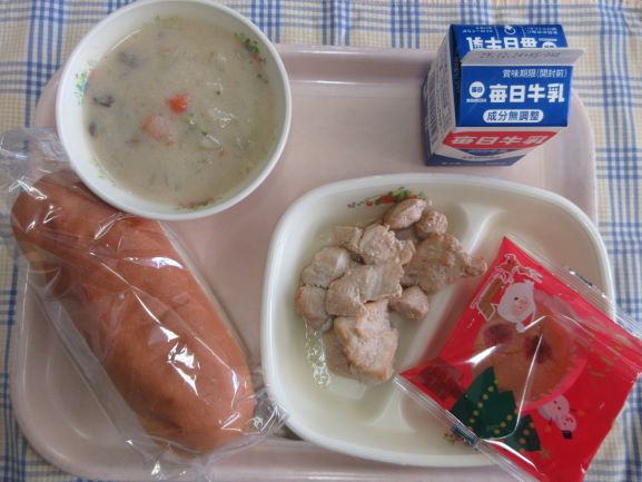 今日は朝から楽しみにしていた子もいる「お楽しみ献立」です。クリスマスなどにちなんだメニューが並びました。シチューも季節の野菜がたっぷりで栄養満点。おいしくいただきます!