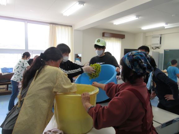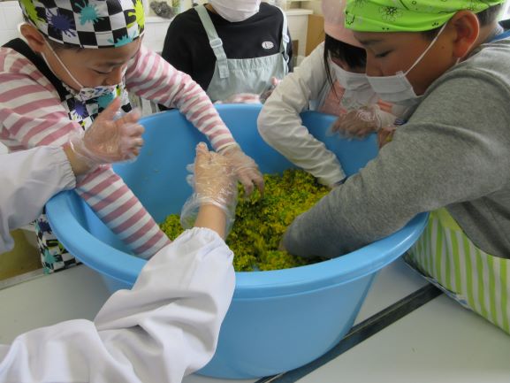 4年生の子どもたちが昨年度から育ててきた菜の花を摘みに行き、菜の花漬け体験をしました。今年度は少し早くから花が咲き始めたため、今日はよい花がなかなかなく、2.4sの収穫にとどまりました。外で選別した花を家庭科室で塩もみし、樽に入れて鷹の爪を上に置きました。内蓋と重しを載せてしばらく漬け込みます。5月中頃くらいに「ぬかざぶとん」をつくって上に敷き詰め、あとは常温保存で半年ほど発酵させる予定です。「菜の花会」保護者の方々も子どもたちと同じくらいの人数で集まってくださりご協力いただきました。ありがとうございました。