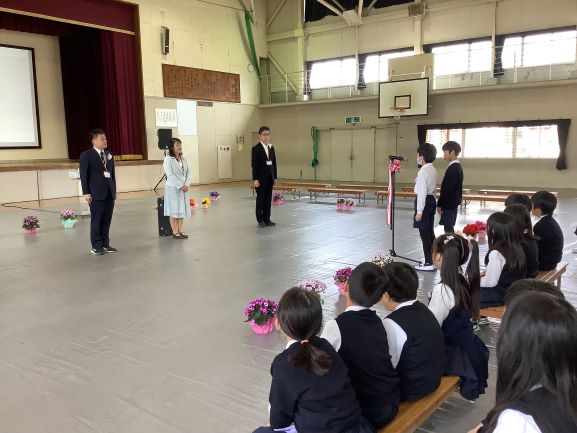 今日から令和8年度が始業しました。1時間目に新しく赴任された先生方を全校でお迎えしました。1人ずつ自己紹介をしていただいた後、6年生代表2名の子どもたちが歓迎の言葉を伝えました。自己紹介では、特技を披露する先生もおられ、1人ずつに温かい拍手が起こりました。6年生児童の言葉もしっかり言えていて立派でした。