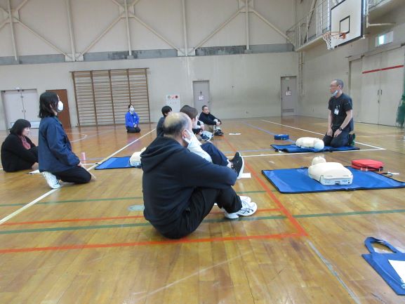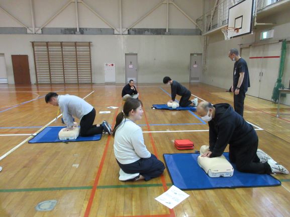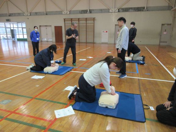 放課後、専門家の方に来ていただき、職員研修として心肺蘇生法やエピペン使用法について実技講習を行いました。ダミーの人形を使って胸骨圧迫をしたり、訓練用のAEDのアナウンスに従って使ったりしました。講師の先生からは「とてもスムーズに行えています」と評価していただきました。エピペンの使用場面も伺い、練習用のエピペンで実技も行いました。実際に使わないといけない場面があってはいけないのですが、万が一に備えて毎年訓練を続けていくことはとても大切だと感じました。講師の先生方、ありがとうございました。