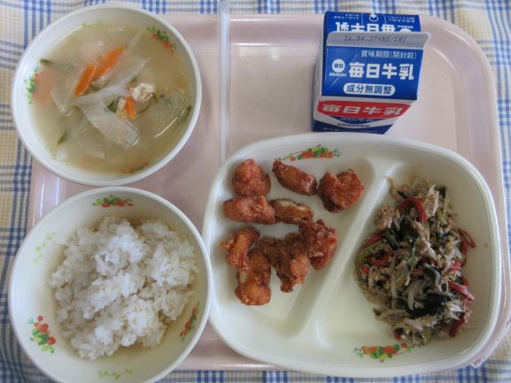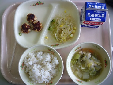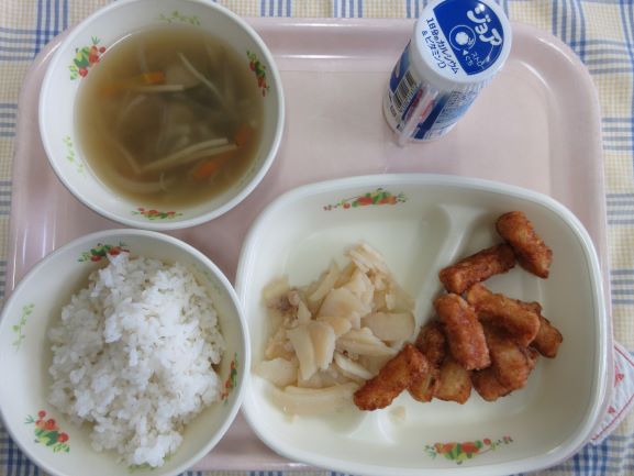本日は滋賀の産物献立です。赤こんにゃくや打ち豆汁は給食の定番になってきました。1年生の子どもたちも「美味しい」と喜んで食べました。