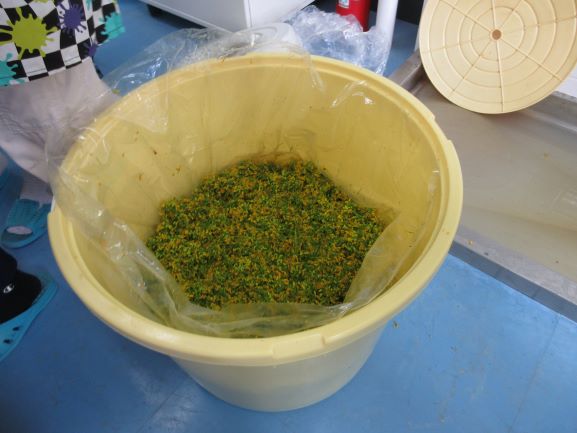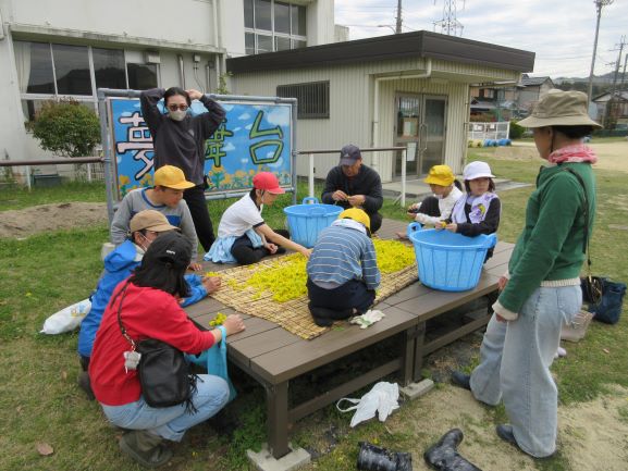 新年度始まって、新しい教職員メンバーと菜の花会の方、子どもたち、卒業生、地域の方々の有志で2回目の菜の花摘みと菜の花漬けを行いました。菜の花はもう満開に近く、お漬け物にするにはちょっと開きすぎの花になっているものもありましたが、合計7.7sの花を塩で揉み、鷹の爪と一緒に樽に漬け込みました。来週月曜日に最終4年生児童が菜の花漬け体験を行う予定です。ご協力くださった有志の皆さん、ありがとうございました。