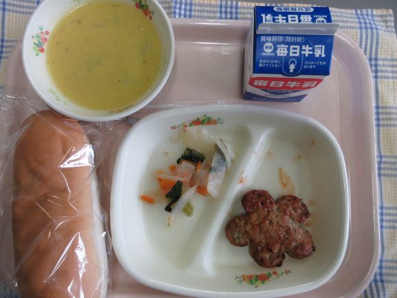 桜の見頃は少し過ぎてしまいましたが、ハナミズキ・八重桜などはきれいな花を咲かせています。今日の献立はそんな季節に合わせて「お花見献立」でした。ハンバーグのお花も咲きました。同じ材料を使っていても、日本料理の飾り包丁じゃありませんが、形が少しいつもと違うということは、華やいだ感じになりますね。こういうところからも、「子どもたちに食べる楽しさを感じてほしい」と考えてくださっている栄養士の先生方の思いが伝わってきます。