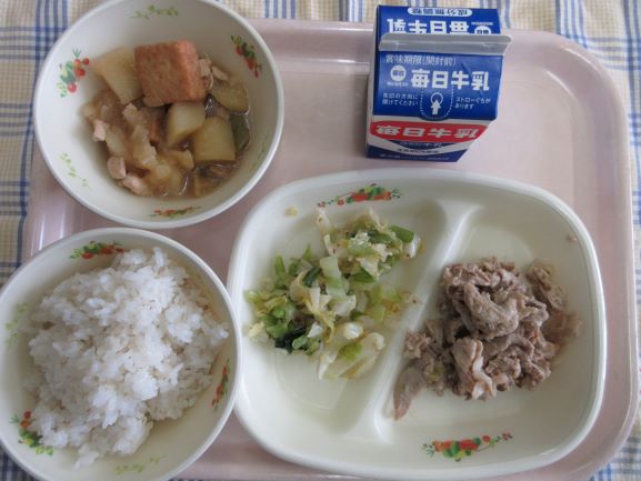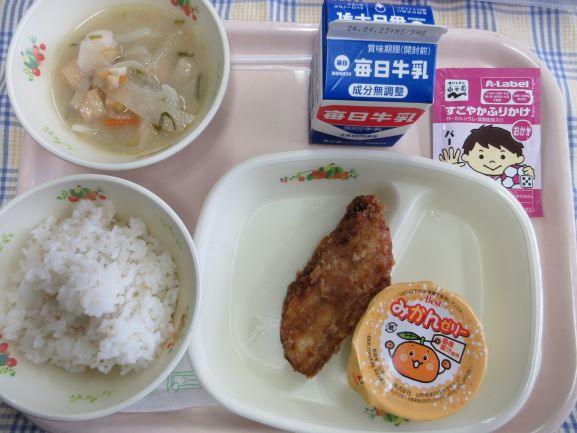 鹿児島県の郷土料理ということで、さつま汁や柑橘をつかったゼリーがつきました。給食の汁物は出汁が効いていていつもとても美味しいです。