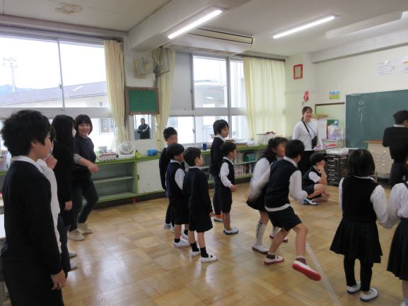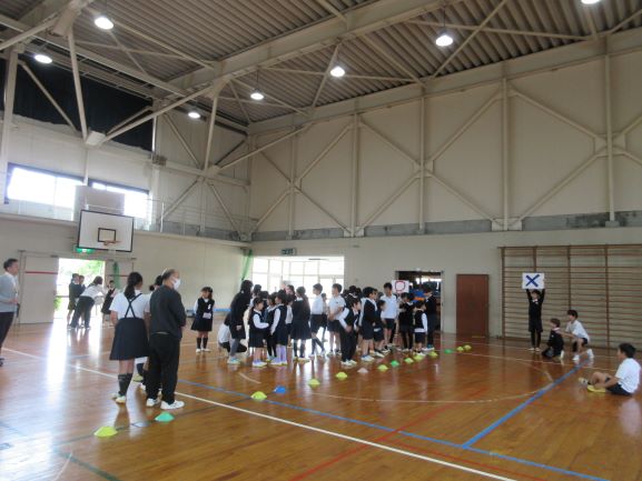 6年生が入学したての1年生を楽しませようと、早々に第1回目の交流会を企画しました。1年生教室まで迎えに行き、6年生の教室で自己紹介をする活動でスタートしました。1年生は1人ずつに拍手をおくりながら静かに自己紹介を聞いていました。その後、「船長さんの命令」と「どんじゃんけん」の2つのゲームを6年生と一緒に楽しみました。1年生は船長さん役に進んで立候補して見事に役割を果たしたり、話をよく聞いてルールを理解して参加したりすることができ、とてもしっかりした印象を受けました。またこれからも交流を続けてみんなが打ち解けていけるといいなと思っています。