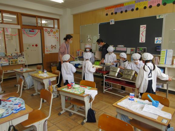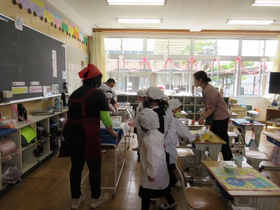 1年生は1週間遅れで今日から給食開始です。全員が給食配膳に関わるということで、みんな白いエプロン姿。それぞれの当番の仕事をしっかり落ち着いて取り組みました。おかわりもどんどんする姿が見られ、もりもり食べられる様子に感心しました。赤こんにゃくも好評でした。これからもっと給食名人さんになっていけそうで楽しみです。