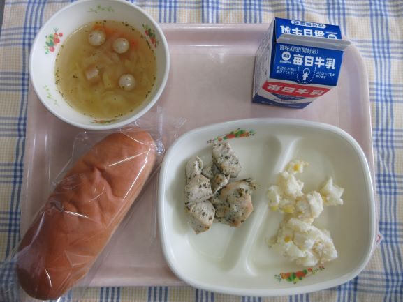 今日は子どもたちの好きな「黒糖パン」でした。ほんのり甘くて人気です。鶏肉はバジルの風味がよく、1年生の子どもたちは「いい匂い!」と喜んでいました。