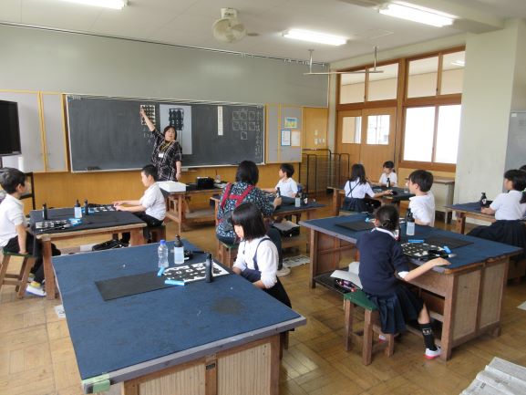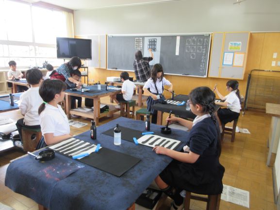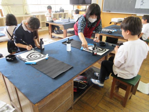 3年生の子どもたちが初めて毛筆に墨をつけて、半紙に作品を書きました。今日は文字ではなく、筆でまっすぐの線やジグザグ線、ぐるぐる線などを書き、鉛筆とは違う線になることを体感しました。先生のお話をしっかり聞いて真剣に取り組んでいる様子、とてもよかったです。これからが楽しみです。