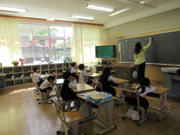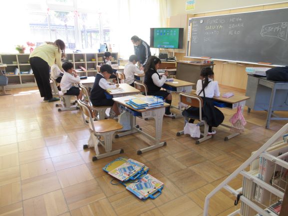 今年度初めてALTの先生が来てくださる日でした。ALTは昨年度に引き続きステファニー先生です。1年生も初めての外国語活動の授業を受けました。1年間使う「ローマ字」表記の名札もつくりました。