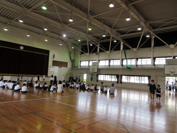 2時間目に1年生を迎える会がありました。1年生が6年生に手をつないでもらって入場しました。その後、1人ずつへ児童会の子どもたちがインタビューをしました。1年生は名前と自分の好きな色を話しました。どの子も最後に「よろしくお願いします」と言えていたので、感心しました。1人ずつへ上級生みんなから温かい拍手が起こりました。その後、児童会の子どもたちが考えた○×クイズを全校でしました。10問ありましたがなかなか難しく、みんないろいろ迷いながら○か×かを選んでいました。正解発表の度に歓声が上がっていました。○×ゲームの後はたてわり班で、5月1日予定のたてわりハイクでの遊びの相談をしました。児童会のみなさん、6年生のみなさん、いろいろな準備、運営、片付けなどありがとうございました。