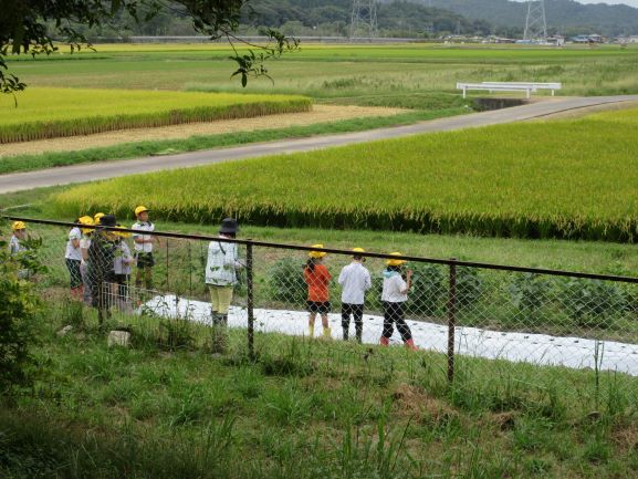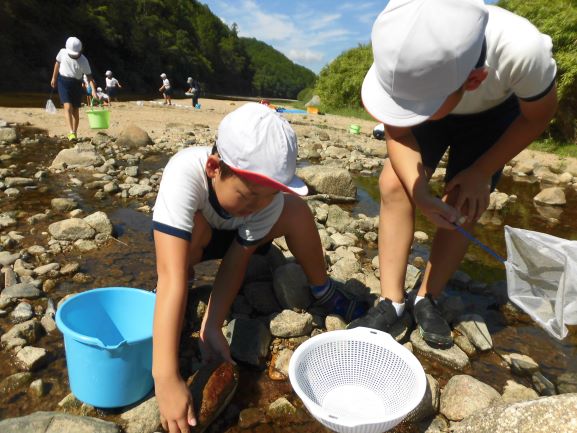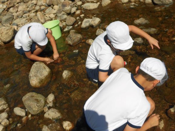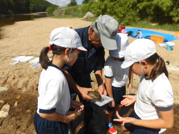 上田上コミュニティセンターの岩ア先生にご指導いただき、4年生が学区を流れる大戸川で自然体験学習を行いました。事前にお話を聴いてから、川に入り、水生昆虫やその他の生き物を見つけ、観察しました。暑さの心配もありましたが、水分補給等の休憩を挟んだり、少し時間を短縮したりして元気に学習をすることができました。見つけた生き物を岩ア先生に見ていただき、何という名前の生き物なのかを教えてもらっている子どもたちもいました。