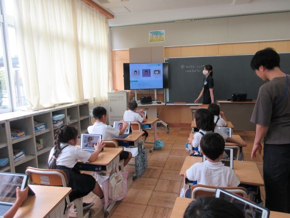 1年生の子どもたちがタブレット端末の使い方について学びました。今日のテーマは「カメラ機能」を使えるようになろう、というものでした。セルフポートレートを撮ったり、拡大・縮小して撮ったりする方法を試しながら見つけていきました。観察のときなどに役に立っていく技能ですね。