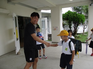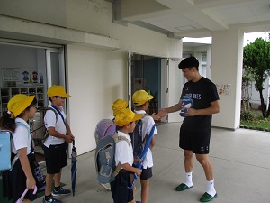 滋賀レイクスの大庭選手が、あいさつ運動で来てくださいました。笑顔で子どもたちを出迎えてくださいました。緊張しながらも、あいさつしたり、話しかけて握手をしたりする子もいました。大庭選手から全校児童に「今日も一日ガンバレ!」というメッセージ入りのサインをいただきました。おいそがしい中ありがとうございました。