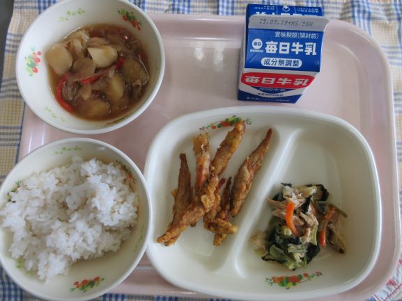 わかさぎ・ゆばは滋賀ではふるさとの味の一つですね。今日はカレー風味のから揚げだったり、小松菜との炒め物だったりと、調理の仕方を工夫してくださっています。ありがたくいただきます。