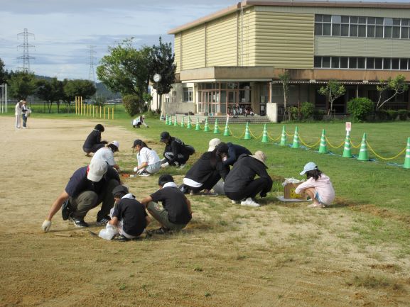 龍谷大学の吉村先生が2年生の子どもたちに出前授業をしてくださいました。まだ暑く秋とは感じられにくいのですが、冬に向かって「育て!大根」の学習をします。今日の授業はその1時間目で、大根について種のまき方など教えていただきました。2年生の子どもたちはすっかり吉村先生と意気投合。その後、吉村先生が夏休み中にきれいに整えてくださった農園の畝にマルチシートをかけ、みんなで種まきをしました。美味しい大根に育つといいですね!吉村先生ありがとうございました。