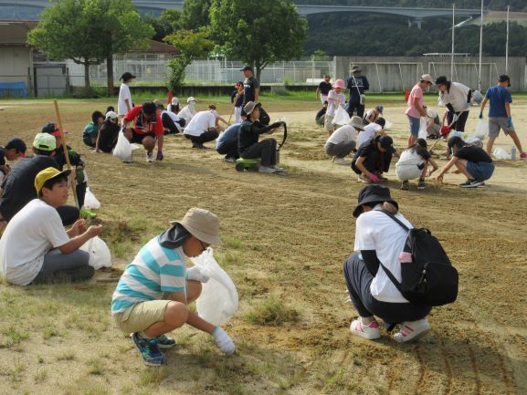 菜の花会の呼びかけで、校庭、中庭、スクール農園などの環境整備作業をしていただきました。朝8時に保護者の方だけでなく、地域の有志の方々もお集まりくださり、運動場の除草や草刈り機での伐採にご尽力くださいました。子どもたちも多数参加して働きました。昨夜には今日の除草がしやすいよう、地おこしをしておいてくださる地域の方もあり、おかげさまで運動場や中庭・農園がすっきりきれいになりました。暑い中、ご協力くださったみなさま、そしてお世話くださった菜の花会のみなさま、ありがとうございました。