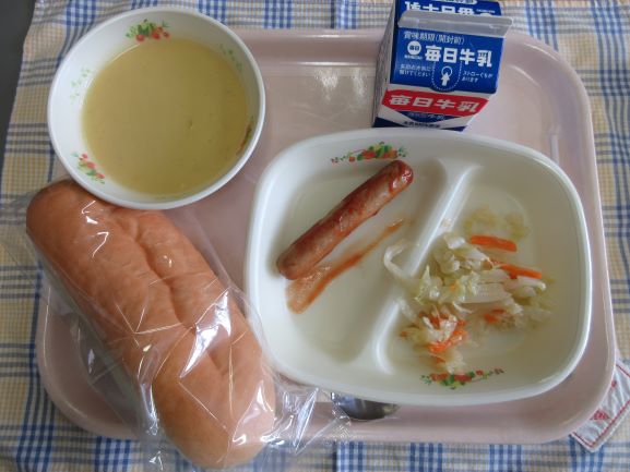 コッペパン・牛乳フランクフルトケチャップソースかけ