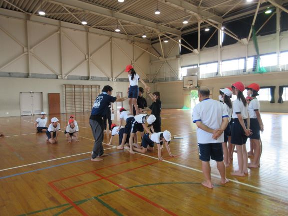 今日は市内の小学校から体育科の授業を研究されている先生をお招きし、5,6年生の組体操の授業をしていただきました。3つの「しん」を大事に取り組んでいくといいというお話があり、「真剣」「信頼」「辛抱」の意味について子どもたちに考えさせてくださいました。その後、基本となる姿勢2つ、「気をつけ」と「たわら」を教えてくださいました。「気をつけ」は自分を見つめ、自分との対話をしていくのだ、というお話がありました。「たわら」では、友だちを支えること、自分の姿勢を保つことを実現するために、背中の形、掌のつけかたなど大事なポイントを教えてくださいました。子どもたちは友だちと姿勢を見合って、確認をしていました。クイックピラミッドなどの技にも取り組みましたが、「真剣」「信頼」「辛抱」を意識して一生懸命チャレンジする子どもたちの姿が見られました。運動会に向け、少しずつ完成度を向上させていきたいです。