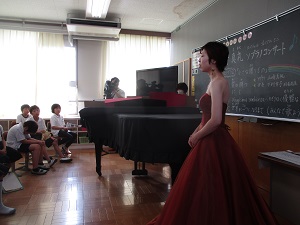 ソプラノ歌手の山アさんがきてくださり、昼休みに歌ってくださいました。なんと下村校長先生の教え子さんで、中学、高校、大学と声楽を学ばれて、現在もソロリサイタルや演奏活動をされています。今日は、校長先生のピアノ伴奏で4曲歌ってくださいました。一緒に歌ったり、手拍子や体でリズムを取ったりする姿が見られました。美しい歌声に癒され、一同が楽しいひと時を過ごすことができました。本当にありがとうございました。