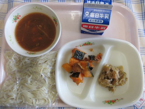 今日は香川県の郷土料理だそうです。「けんちゃん」というおかずは野菜たっぷりで暑さに負けず過ごせそうです。ありがたくいただきます。