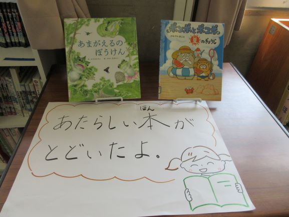 今年度週2日勤務してくださっている司書の先生。図書室の整備や子どもたちへの関わり、本に親しめる環境づくりなど、とても熱心に取り組んでくださっています。本棚はあいうえお順に整理され、シリーズ本は番号順にまとめて置かれるなど、子どもたちが探しやすい状態なっています。また、季節などに合わせて絵本を紹介してくださり、6月の今は「雨」や「水」に関する本が並べてあります。新刊紹介コーナーもあり、今後が楽しみです。子どもたちが少しでも本に親しんでくれるといいなと思っています。