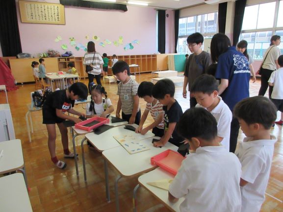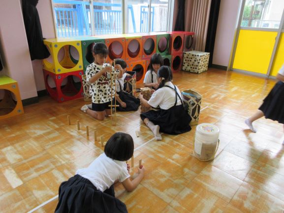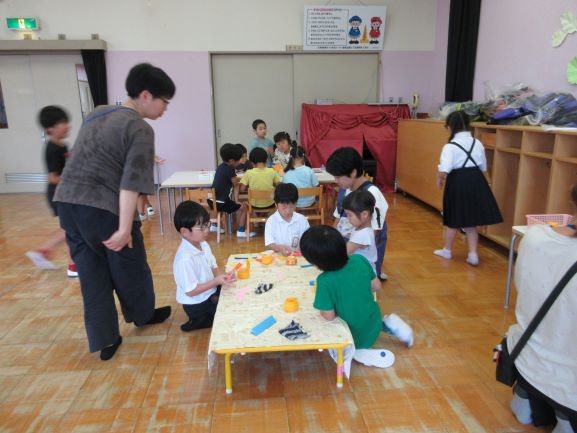 雨模様でしたがお隣の上田上幼稚園へお邪魔して、5歳児さんと一緒に1時間遊びました。紙飛行機をつくって飛ばしたり、ジェンガを高く積み上げたり、七夕飾りをつくったりと、思い思いの活動に取り組みました。特に上田上幼稚園出身の子どもたちは久しぶりに幼稚園の先生方に声をかけてもらい、親しんでいた教室で活動でき、とても楽しそうにしていました。少しずつお互いの名前を覚えていけるといいですね。