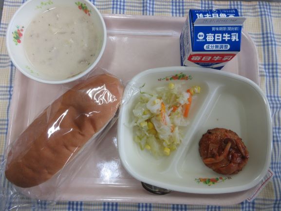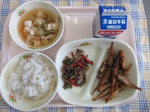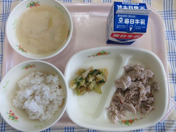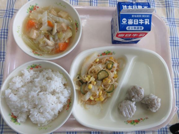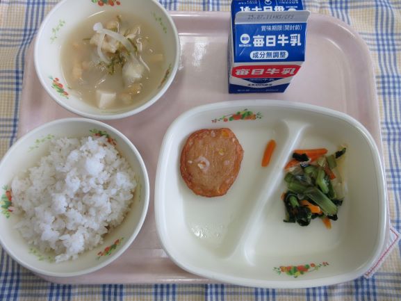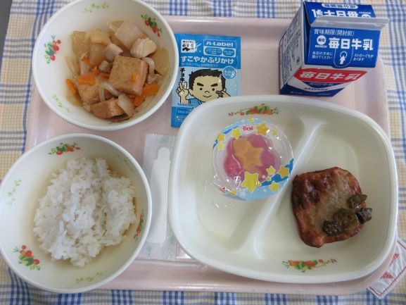今日は千葉県にちなんだ献立だそうです。タンタンメン風スープは具だくさんで栄養たっぷりです。あじのさんが焼きにも野菜が彩りよく入っています。夏ばてをこれで防げそうです。