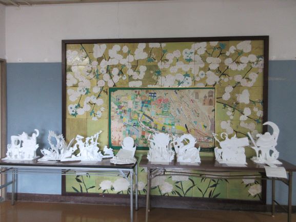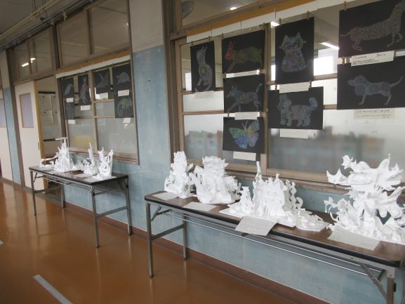 図画工作科の学習で発泡スチロールを使った立体作品を6年生がつくりました。今、廊下で展示されています。細かいパーツをうまく組み合わせて思い思いの作品ができています。