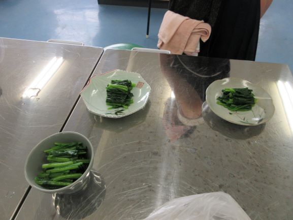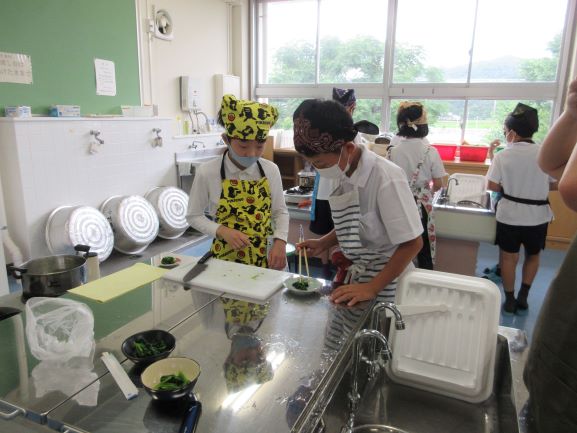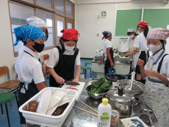 2回目の調理実習は「ほうれん草のおひたし」をつくる学習でした。グループで協力して色よくほうれん草をゆで、長さを揃えて切って見た目も美しい仕上がりを心がけていたところに感心しました。おうちでもまたつくれるといいですね。