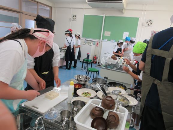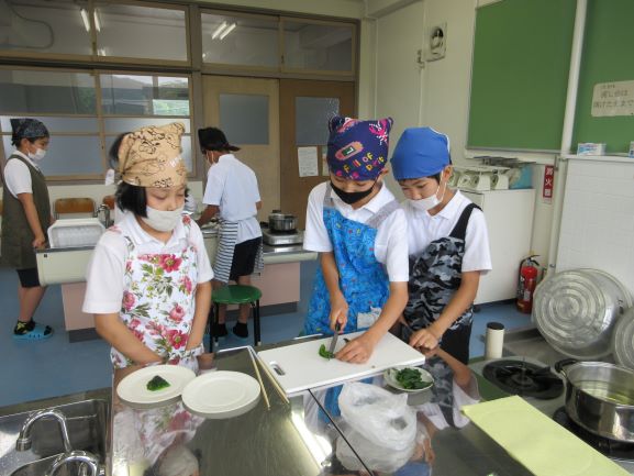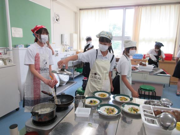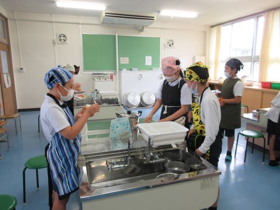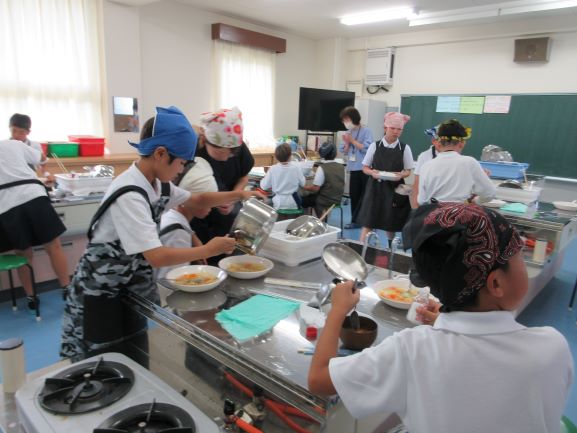 6年生の調理実習は、ご飯・豆腐のみそ汁・ベーコンと野菜の炒め物をつくる学習です。野菜・ベーコン・豆腐をきれいに切ったり、みそ汁をつくったりする活動をグループ別に協力して行っていました。彩りよく美味しい昼食ができました。