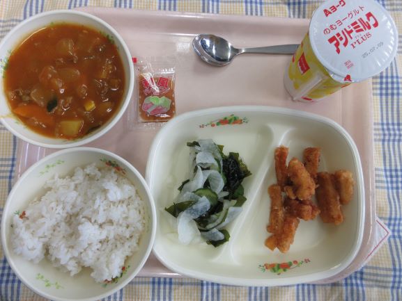 今日のカレーは真野北小学校のおすすめです。かぼちゃやとうもろこし、たまねぎ・にんじん・トマトなど野菜がたくさん入っているカレーでした。