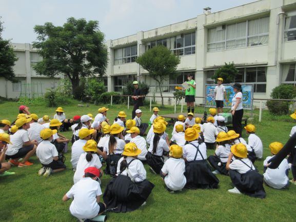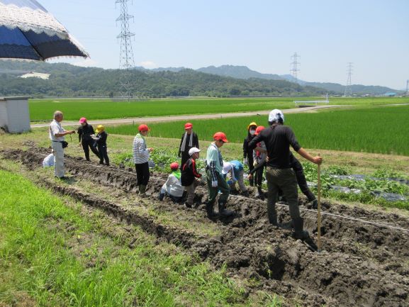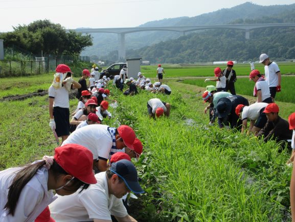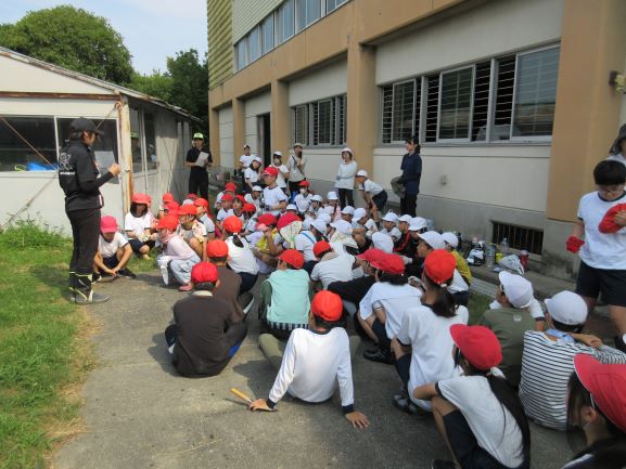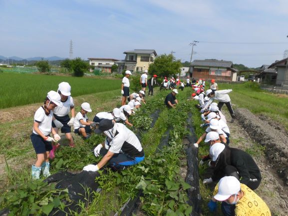 びわ湖の日にちなんで、全校でさつまいも畑の除草作業を行いました。暑さ厳しい日でしたので、10分間だけ集中して作業する、ということを全体説明で聞きました。さつまいもを抜かないように注意して、違う植物を選んで抜いていきました。暑い中、みんながんばって抜いたので、畑がすっきりしました。