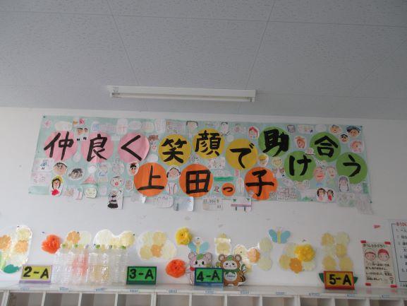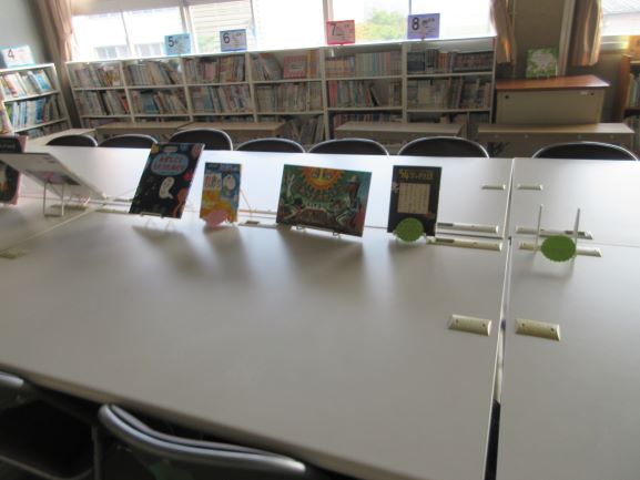 児童会の子どもたちは、今年度の上田上小学校のスローガンを募り、決定しました。「仲良く笑顔で助け合う 上田っ子」です。全校の子どもたちが自分の似顔絵や学校ゆかりのイラストを1枚ずつ描き、児童会の子どもたちが丁寧にスローガンの周りに貼り付けてくれました。児童昇降口に掲示してあります。またご覧ください。図書委員会の子どもたちは、おすすめの本の紹介をポップアップカード風にして、並べてくれています。このカードがあることで、「手に取ってみよう」という気持ちになる子たちも出てきています。