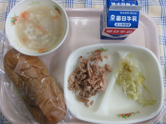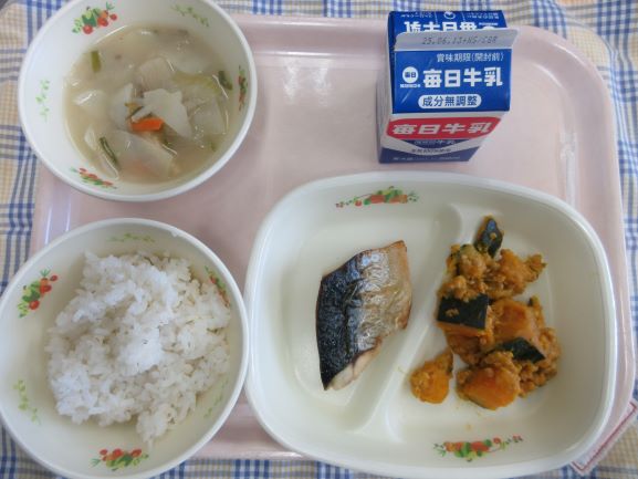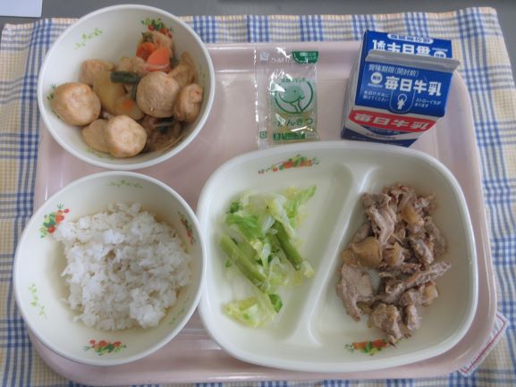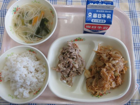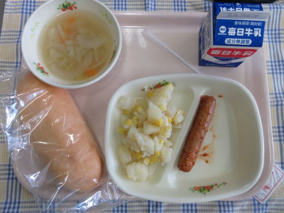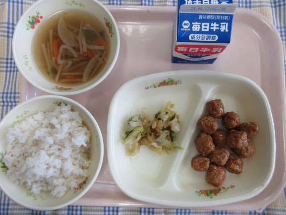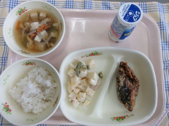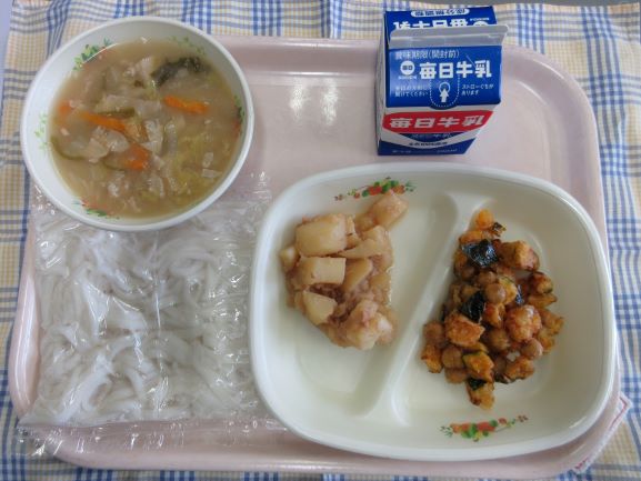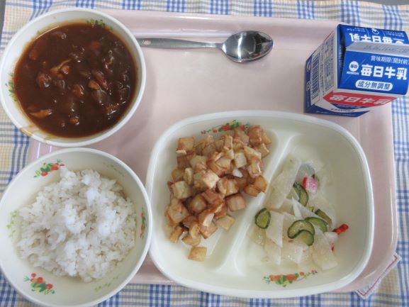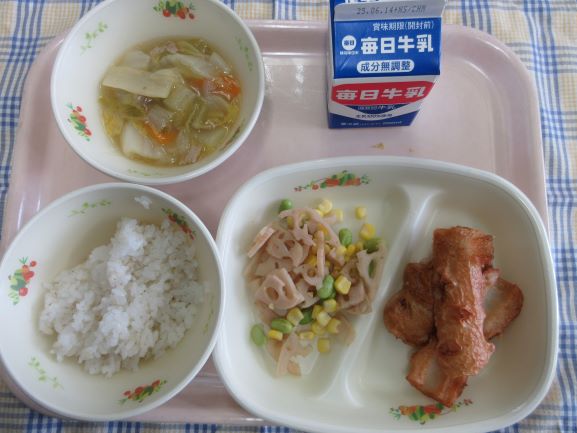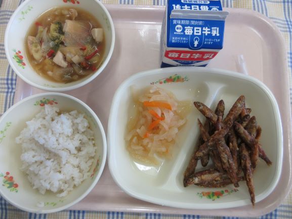 今日は子どもたちの好物が並びました。1年生の子が「わたしの大好きな給食!」と話してくれました。たくさん食べてすくすく大きくなあれ。