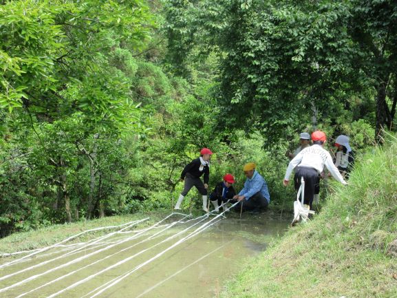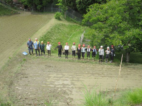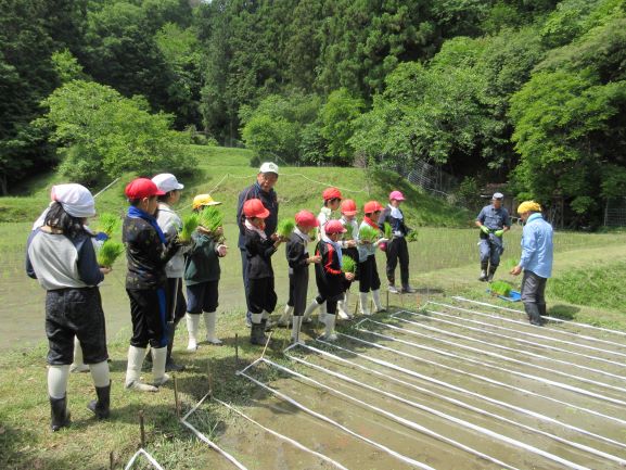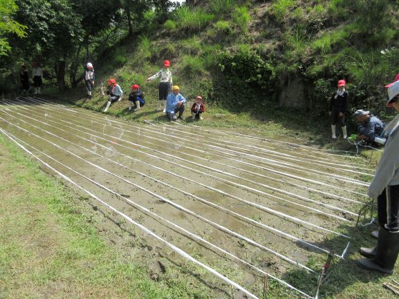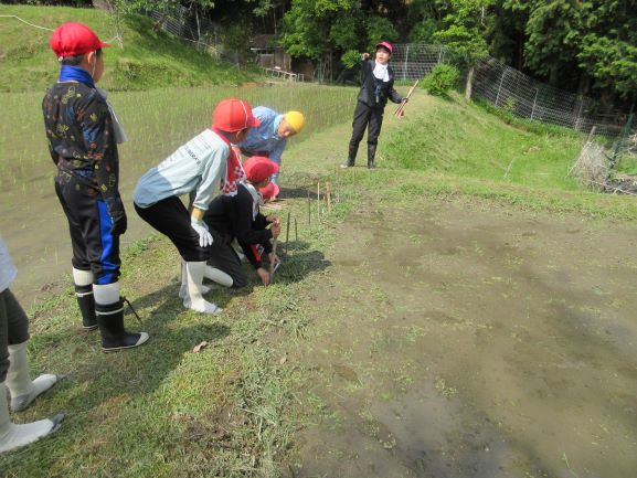 今年度も古市様・岩ア先生にお世話になり、牧の網掛というところの棚田で5年生が田植えの体験をさせていただきました。始めは竹の棒を田の周りに30cmくらいの間隔で立てて、白い紐をかけていきました。まっすぐ苗を植えるためです。紐のかけ方も教えてもらってみんなで交代でかけました。
