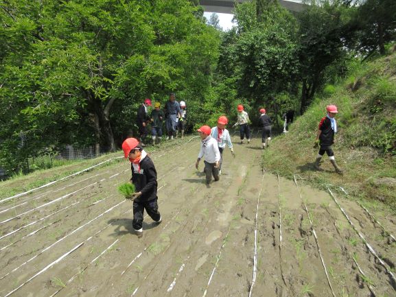 紐をかけた後は、いよいよ田植えです。吉村先生からいただいた農作業用の長靴下をはいて早苗を手に田の中へ。泥が深くて苦戦もしましたが、紐を目印にきれいに植えていくことができました。山の水で手などを洗わせていただき、みんなでお礼を言いました。「お米作りの苦労がちょっとわかった。」「植えるのは楽しかった。」などの感想も聞かれました。いろいろ準備・ご指導くださった古市様・岩ア先生、そして靴下のご協力をくださった吉村先生、みなさまお世話になりありがとうございました。