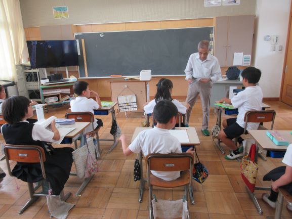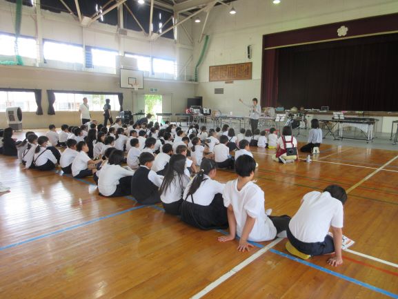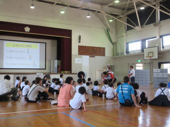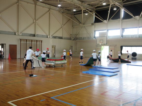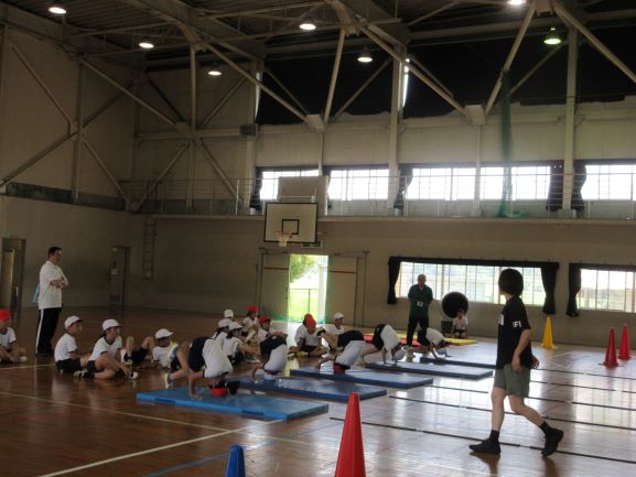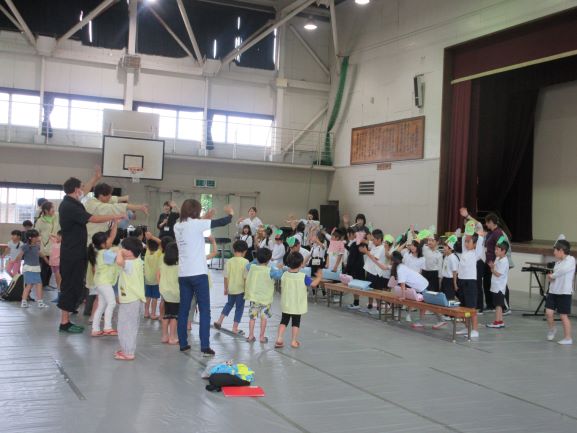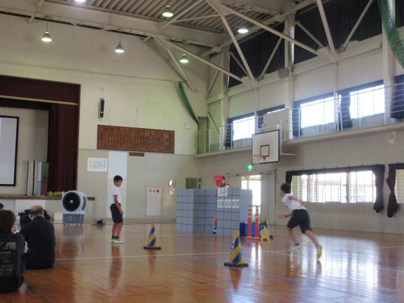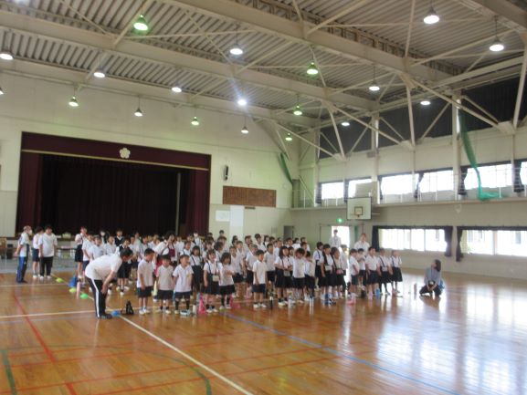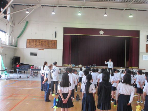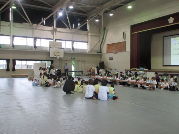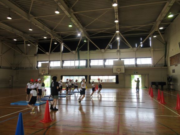 大道遊先生が2校時に1,2年生、3校時に3,4年生の出前授業をしてくださいました。冷風機を回しお茶休憩も多めに取って、体調管理に気を配りながら、リズムジャンプやサーキット運動に浸る学習をしました。子どもたちは暑さをものともせず、音楽の軽快なリズムを楽しみ、友だちと一緒に動くおもしろさも感じて、いきいきと活動していました。大道先生には幼稚園から教えてもらっている子たちもいて、先生と学習できるのが嬉しくて仕方ないという感じでした。最後は片付けも協力し合ってできました。大道先生、ありがとうございました。