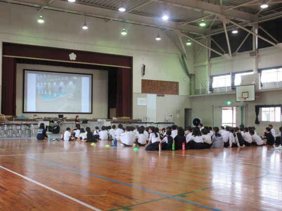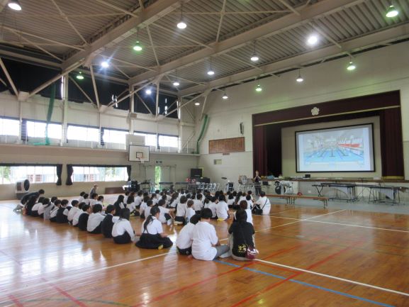 今年度の水泳学習について全校で話を聞きました。プールの様子がわかる写真を見て、子どもたちは歓声をあげていました。少しでも水に親しみ、安全に水泳の学習を楽しんでいくことができたら、と思っています。