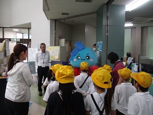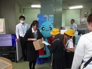 2年生は、学校周辺のお店や施設を見学させてもらって、それぞれの場所でのお仕事について学んでいます。今日はJAさんを訪れました。JAという意味やお仕事など、お話を聞かせていただいたり、100円硬貨巻きを体験させてもらいました。最後は、JAのマスコットキャラクターびわたんと記念撮影をしたり、お土産もいただきました。町たんけんでお世話になったお店や施設の皆様ありがとうございました。