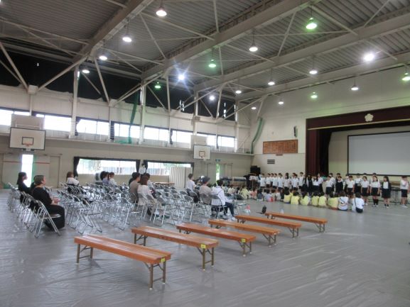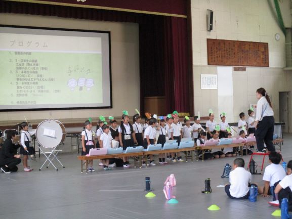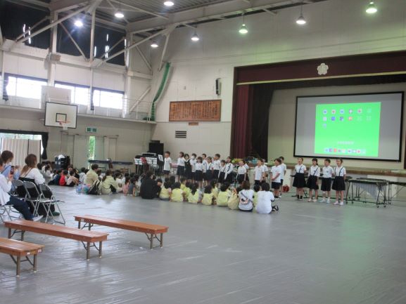本日3校時は13日に本番予定の音楽会リハーサルを行いました。今年度1回目の学校公開を兼ねており、上田上幼稚園・正休ののはな保育園・正休保育園の5歳児さんも参加してもらいました。園児さんや学校公開にきてくださった方々に、高学年・中学年・低学年の順で演奏をきいていただきました。