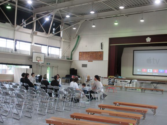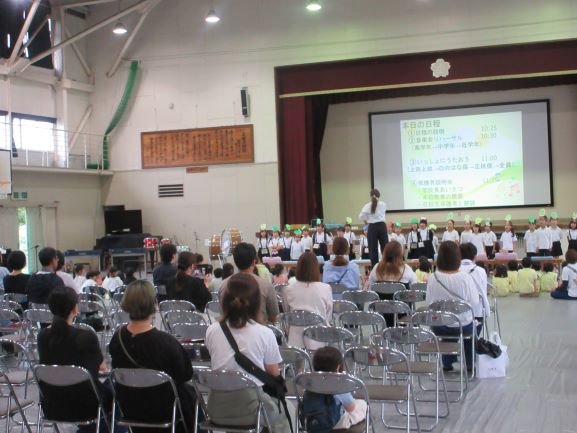 全校の演奏の後は、3園の5歳児さんたちがそれぞれ歌を1曲ずつ披露してくださいました。そして最後は、3園の5歳児さんと上田上小の低学年の子どもたちが一緒に「さんぽ」を歌いました。低学年の子たちは順番に楽器も入れながら歌っていました。会場は温かい拍手に包まれ、お互い手を振りながら5歳児さんは各園に帰られました。学校公開に来てくださった方には、学校説明を行ったり、車座になって本校「菜の花会」のPR部の保護者さんが保護者の立場から説明してくださったりしました。「この学校の先生方は楽しそうに子どもたちに接している」という嬉しい感想もいただけたようでした。いろいろご協力いただいた関係者のみなさま、ありがとうございました。