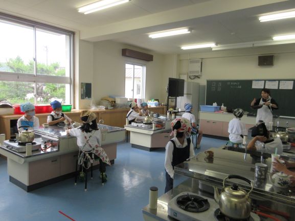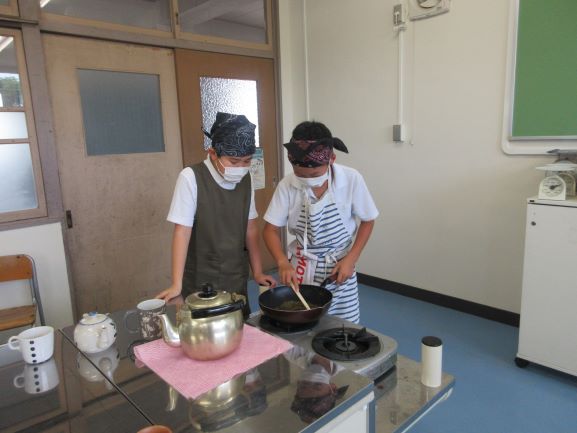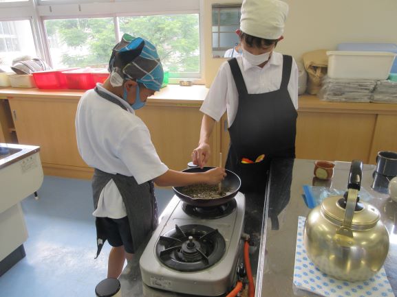 5年生は家庭科の学習が始まって初めての調理実習を行いました。お湯を沸かし、お茶を入れようという内容です。お湯を沸かして少し冷ましている間に自家製ほうじ茶も体験してみようと、フライパンで茶葉を煎りました。とても香ばしい良い香りが廊下にまで漂ってきていて、他の学年の子どもたちも「良い匂い」と言って見に来るほどでした。安全に実習ができすばらしかったです。
