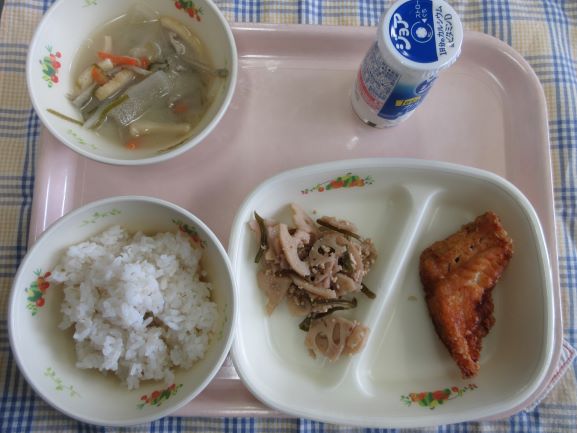 子どもの日にちなんでお節句献立を用意してくださいました。たけのこは旬の食材の上、ぐんぐん成長するという縁起物でもあります。子どもたちの大好きなから揚げもあり、うれしい献立になりました。