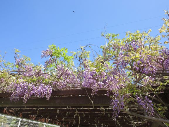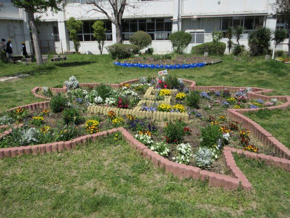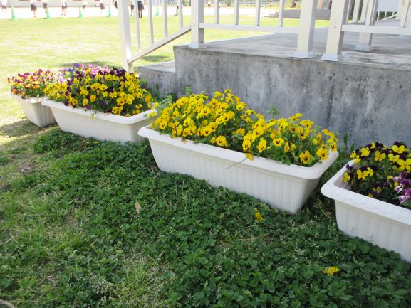 暖かくなり学校の桜は若葉に変わってきました。プランターや夢花壇、そして藤棚にはお花がいっぱいになってきています。教頭先生がいつもまめに水やり、手入れをしてくださっています。