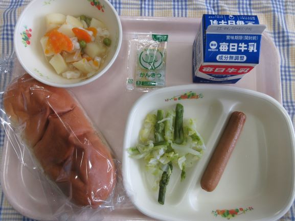 今年度初パンの日になりました。パンに合うおかずで食べやすくしてくださっています。ありがとうございます。