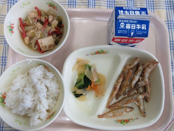 滋賀の食材をつかったメニュー。小魚が苦手な子もいますが、から揚げだと食べやすい、と考えてくださっているのだと思います。ありがたく今日もいただきます。