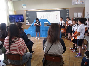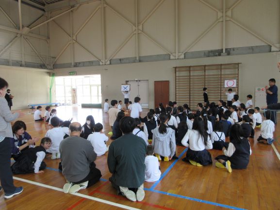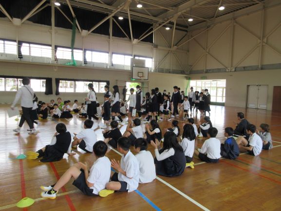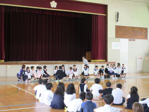 2時間目に全校で1年生を迎える会をしました。5,6年生の児童会、そして6年生全員が準備を進めて、運営してくれました。6年生は1年生の手をとりながら一緒に入場、1年生はたてわり班ごとに横1列に座りました。児童会の子どもたちが順番に1人ずつインタビューをし、1年生はちょっぴり恥ずかしそうに名前や好きな色について答えました。その後はみんなで○×クイズをしたり、たてわり班で分かれて自己紹介や遊びの相談をしたりしました。5月7日(水)に予定しているたてわりハイクでは、このたてわり班で一緒に遊びます。5,6年生、上手に進めてくれてありがとうございました。